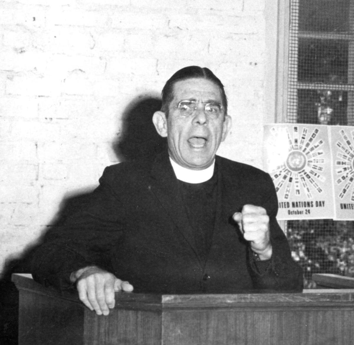 These are the points, ladies and gentlemen, that need a great deal of looking into. I worry about articles that you read in the newspapers and, if you pardon me for a moment, if I can pull it out of my file here, I’d like to share with you an article that was in yesterday’s paper. The headline of this article reads, “The Russians Attack United States on Riots.” [Here Father Twomey reads from the article a quote from Moscow Radio:] “The scenes of bloodshed in Montgomery are reminiscent of the worst savagery, and these things are taking place in a country which has the boldness to declare that its way of life is an example for other people. These outrages make us wonder whether we are really in the 20th century.” The countries of Africa [At this point, the tape stuck, and it is not known how much was lost. When the transcript picks up, it appears that Father Twomey is speaking of segregationists:] [They will have] to answer the charge that they are undermining the cause of peace with justice throughout the world. [Applause]