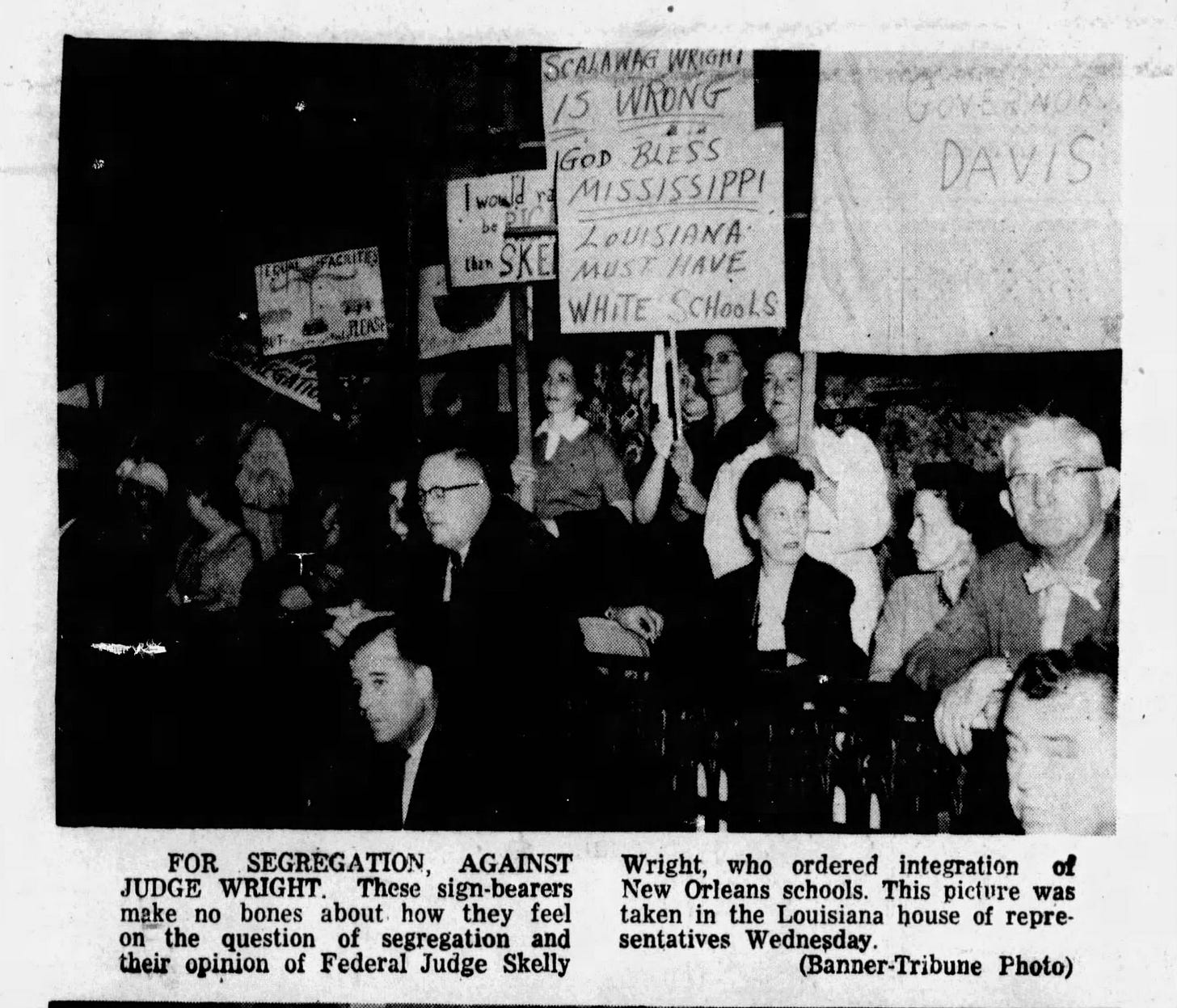 For weeks on end, the Wrights received a constant stream of telephone threats, both at home and at Judge Wright’s office. A cross was burned on their lawn, and a cadre of New Orleans policemen showed up reluctantly on assignment to guard their house. A mob of segregationists descended upon the state capitol to lead a mock funeral of Wright and were welcomed by legislators, as the New Orleans Times-Picayune reported: